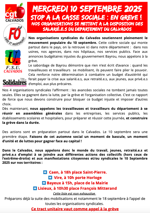 Nos organisations syndicales du Calvados soutiennent pleinement le mouvement populaire du 10 septembre. Cette colère sociale qui monte partout dans le pays, on la retrouve ici dans notre département : dans nos usines, nos agences, dans nos hôpitaux, nos services publics. Face aux annonces budgétaires injustes du gouvernement Bayrou, nous appelons à la grève.