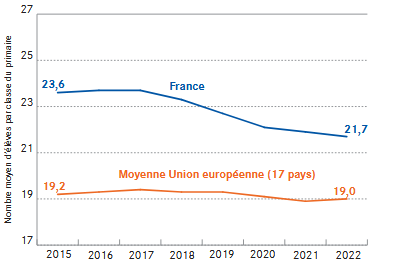 De fait, une étude de la DEPP de janvier 2025 nous apprend que les effectifs de classe dans le Primaire sans en baisse continue depuis 7 années, pour arriver à une moyenne de 21 élèves par classe dans les écoles élémentaires publiques et 21,7 élèves en maternelle ; chiffre qui justifie pour le nouveau ministre Édouard Geffray de pouvoir annoncer, sans trop de risque, que la moyenne sera de 21 élèves par classe en moyenne dans le primaire à la rentrée prochaine : on y est quasiment déjà !