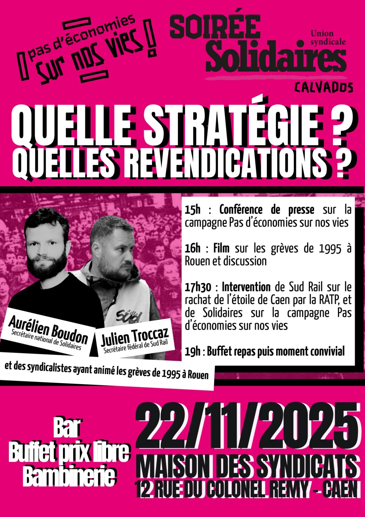 Solidaires 14 vous invite le samedi 22 novembre à une journée de discussion et de convivialité autour de l'anniversaire des 30 ans des grèves de 1995 et du lancement de la campagne nationale de Solidaires "Pas d'économie sur nos vies".